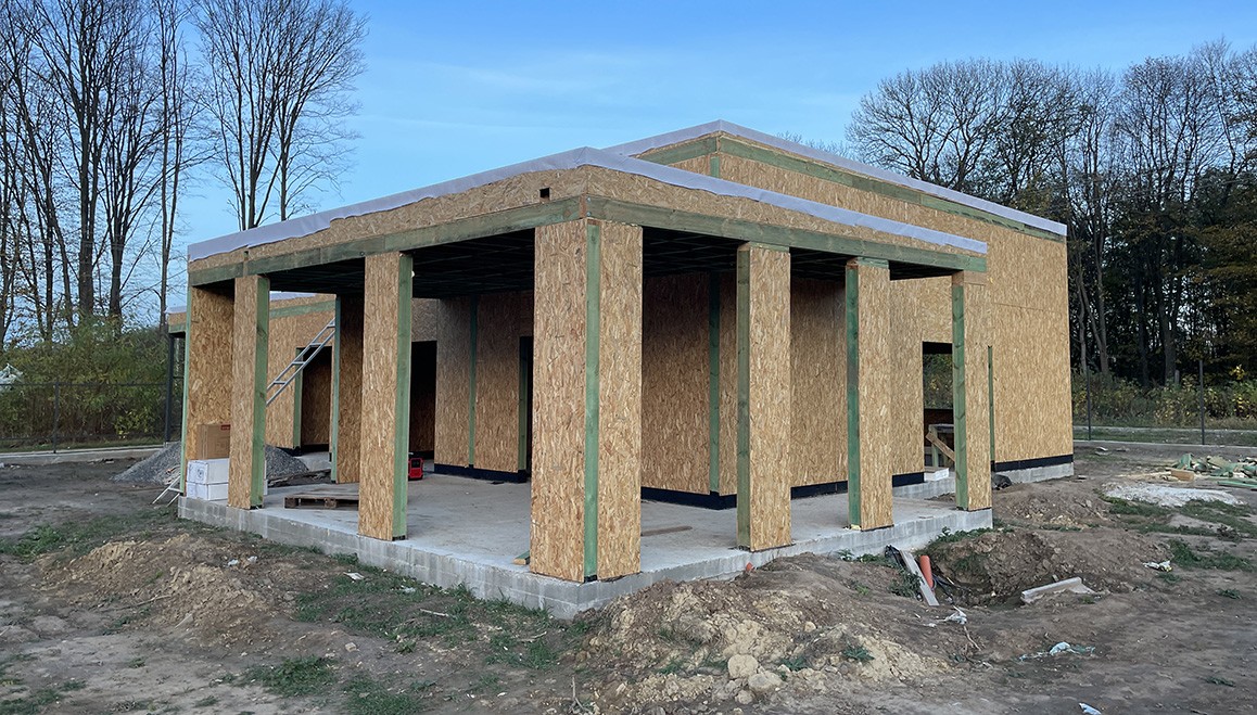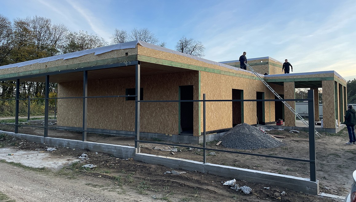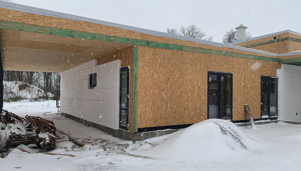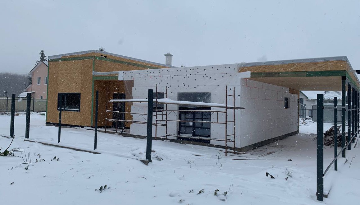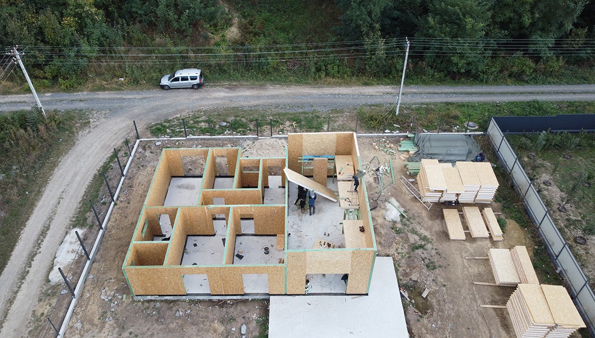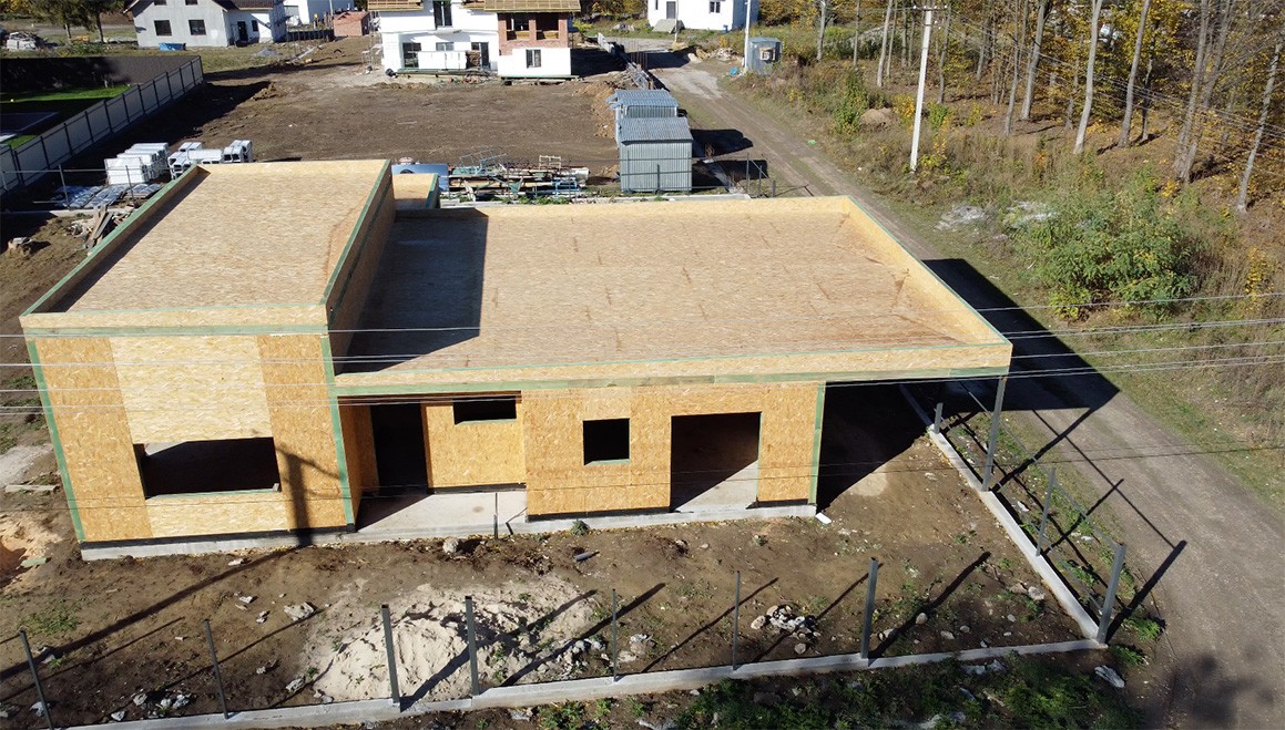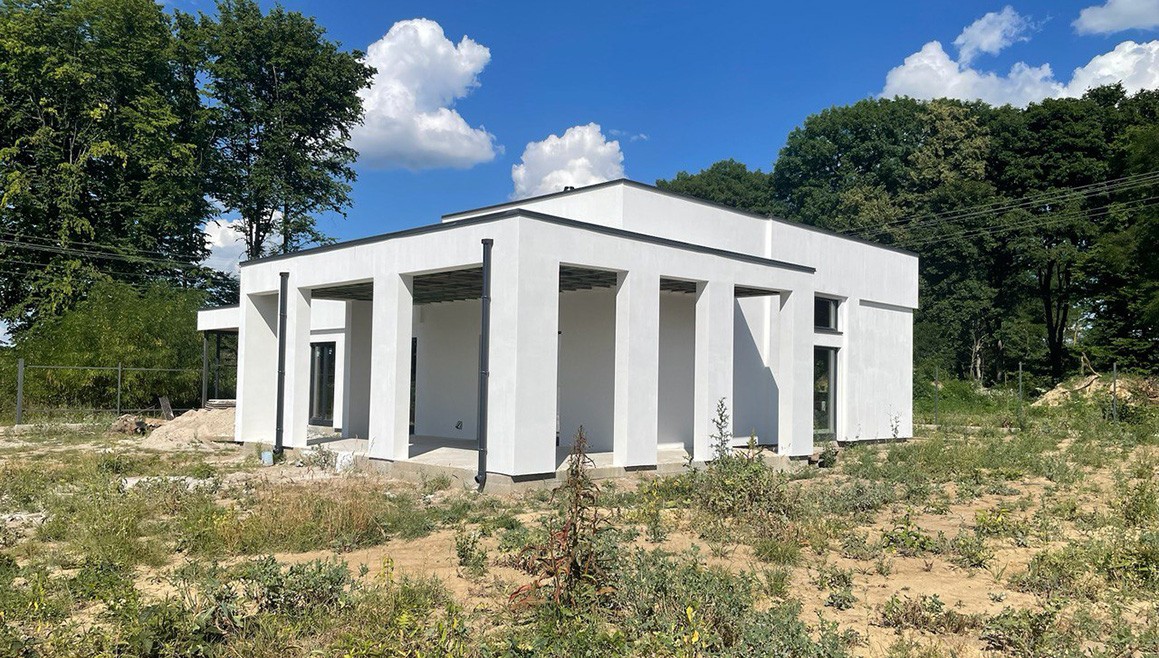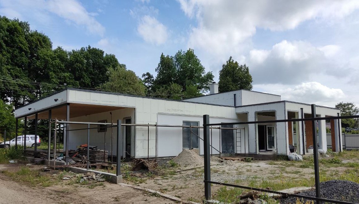 Головною особливістю є висота стелі, яка становить 4,2 метра, надаючи будинку додатковий елегантний характер. Клієнт також додав велику терасу та навіс для автомобіля, створюючи зручний та функціональний простір для відпочинку.