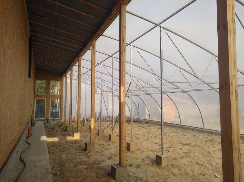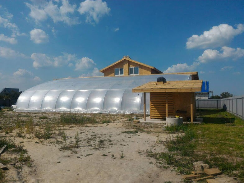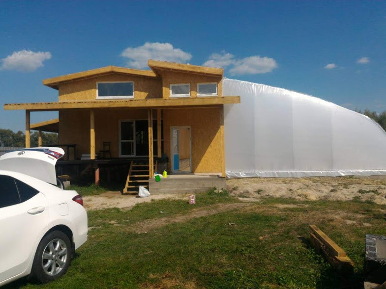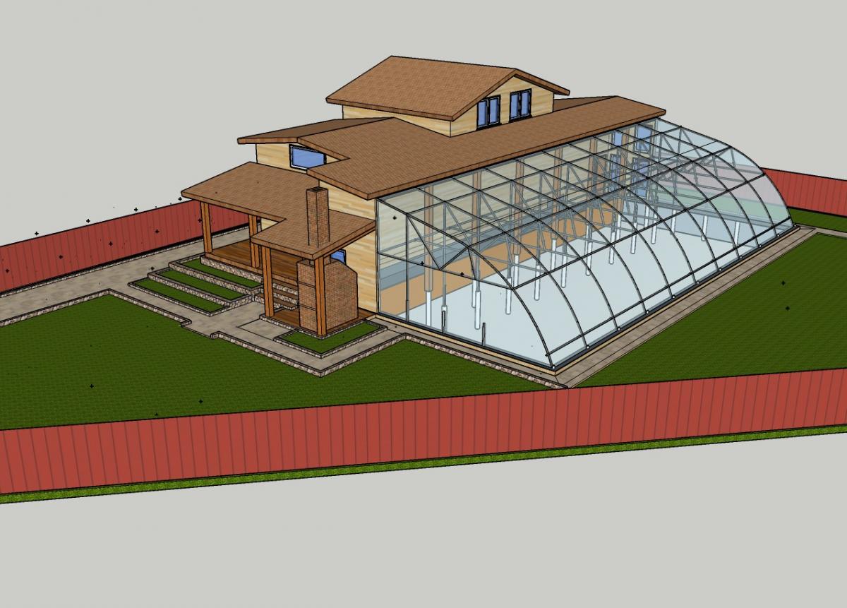 Енергоефективний будинок із сіп панелей за незвичним проектом зведений в с. Требухів Броварського р-ну. Основа робіт - будівництво за канадською технологією. На представленому ескізі можна побачити загальну конструкцію, що відрізняється від типової своєрідною плануванням наявністю вегетарія для вирощування рослин цілий рік.